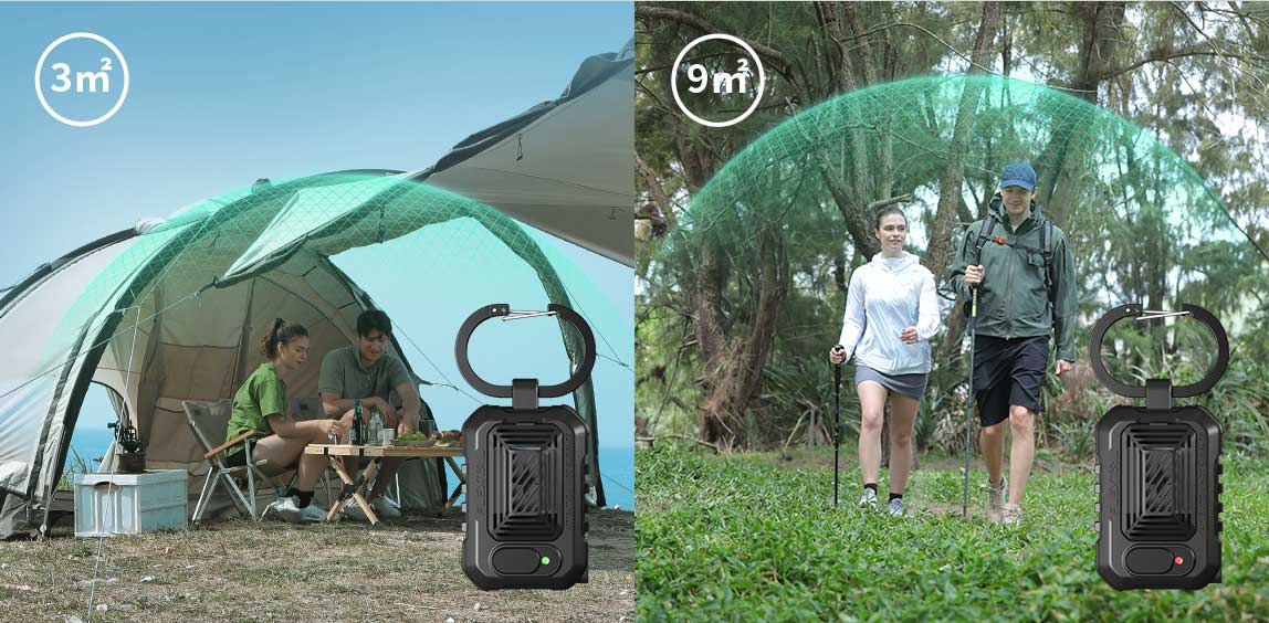 You can't stay in a tent at all times when you're outdoors. What if the mosquito's repellent range is not wide enough when climbing the mountain? LIGHT REPELLER is designed with 2 modes --- outdoor mode and camp mode. Press and hold the power button for 2 seconds to enter the camp mode of 10ft repellent range, with the green indicator light on. Then press the power button again to enter the outdoor mode that activates the powerful mosquito repellent for 30ft repellent range, the indicator light will turn red. Press the power button once again to switch off the LIGHT REPELLER.